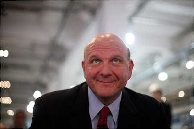 The online version also shows that photo, but for the real impact you have to get the print edition. Just imagine — it’s Sunday morning, you just woke up, you’re having your coffee and flipping through the sections, there’s some nice travel piece about bicycling in Vermont and then — bam! Jesus fucking Christ! Suddenly there’s this huge photo of Ballmer looking like a doofus and you think, wait a minute, this guy runs a company? A really big important company? Like, one that does billions of dollars in sales each year? You’ve got to be kidding.